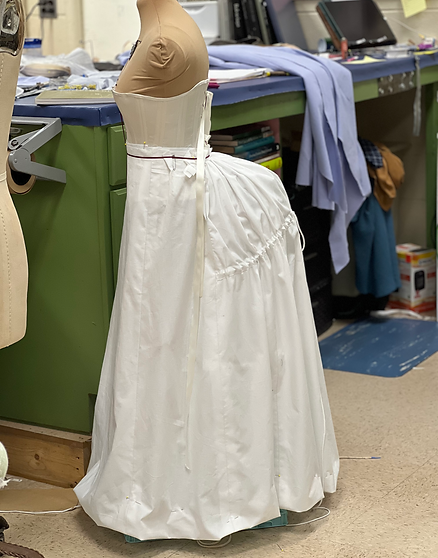 This project is given to create a Bustle Dress based on a painting by James Tissot. I chose his painting The Bunch of Lilacs. This painting is from 1875 and is arguably closer to a tea gown rather than a true Bustle Gown. However, it was decided by my professor and I that for the purpose of this project it would be appropriate to create a full bustle cage regardless. Additionally, I created the petticoat and the corset for this piece. These are highlighted in the "Understructures" page of this website.